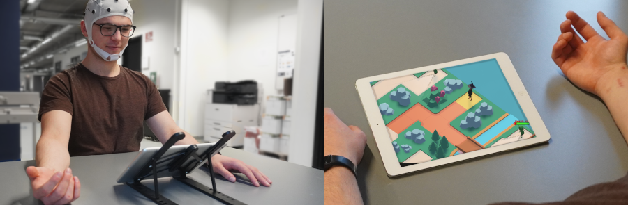 I forskningsprojektet undersøger vi, hvordan man kan blande træning og underholdning i et computerspil ved brug af BCI-teknologi. Teknologien benyttes både som træningsredskab samtidig med at et spil bliver styret ved hjælp af brugerens egne hjernebølger. På billedet ses et eksempel på et computerspil der inkluderer træning af hånden. Vi håber at videreudvikle BCI-teknologien så den en dag bliver velfungerende og effektiv til træning af bevægelser.